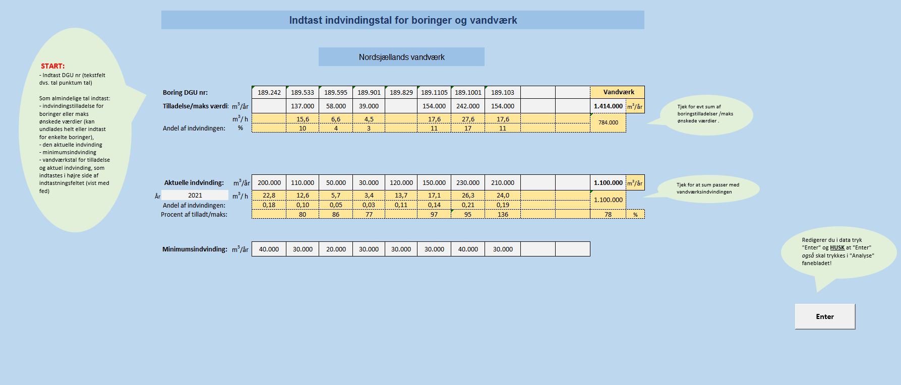Kravene til datainput er tal for aktuel indvinding og minimumsindvinding. Indvindingstilladelser eller ønskede maksværdier for alle eller udvalgte boringer kan også indlæses (se neden for). Derudover indlæses boringskontroldata fra Jupiter databasen.