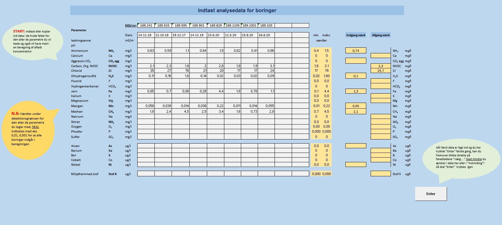 For overskueligheden er de fordelt på indgang- og afgang værk faneblade. Parametre under ”Indgang værk” – vist i figuren neden for, fjernes ved almindelig vandbehandling herunder også arsen, som almindeligvis også fjernes ved binding til okker i vand med tilstrækkelig jern indhold.